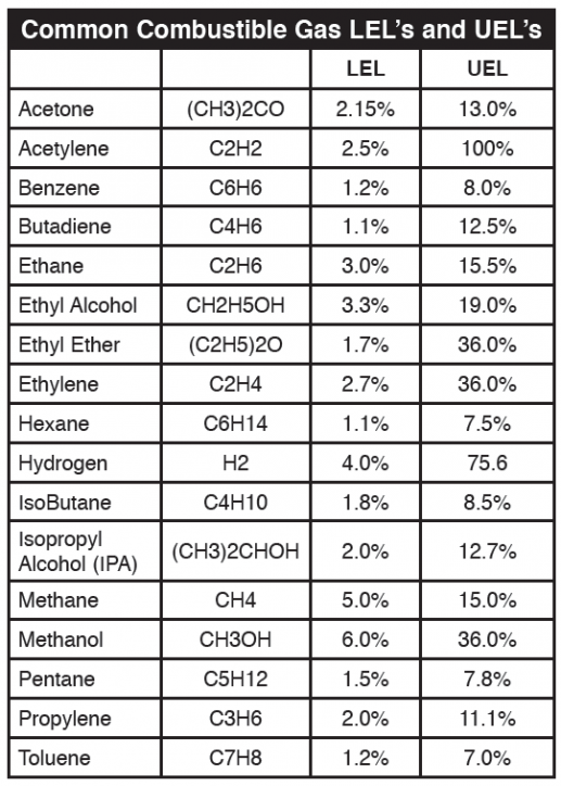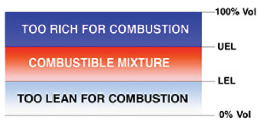 Rủi ro đầu tiên liên quan đến khí gas dễ cháy (Combustible) và hơi là khả năng gây ra nổ. Sự nổ giống như đám cháy, yêu cầu 3 thành phần tham gia: nhiên liệu (Fuel), Khí oxy (Oxygen) và nguồn đốt cháy hay bắt lửa (Ignition source). Mỗi khí gas dễ cháy hoặc hơi sẽ chỉ bốc cháy ở một giới hạn nhất định trong tỉ lệ pha trộn giữa khí và không khí. Nhiều khí gas quá hay ít khí gas quá cũng sẽ không gây ra cháy, những điều kiện trên được định nghĩa là Giới hạn thấp hơn để nổ ( Lower Explosive Limit) hay viết tắt là LEL, và giới hạn cao hơn để nổ (Uper Explosive Limit) hay viết tắt là UEL. Bất kỳ lượng khí gas nào nằm trong giới hạn LEL và UEL đều có khả năng gây nổ. Mức độ tập trung gas được thể hiện bởi phần trăm của tổng dung tích, với cân bằng không khí.